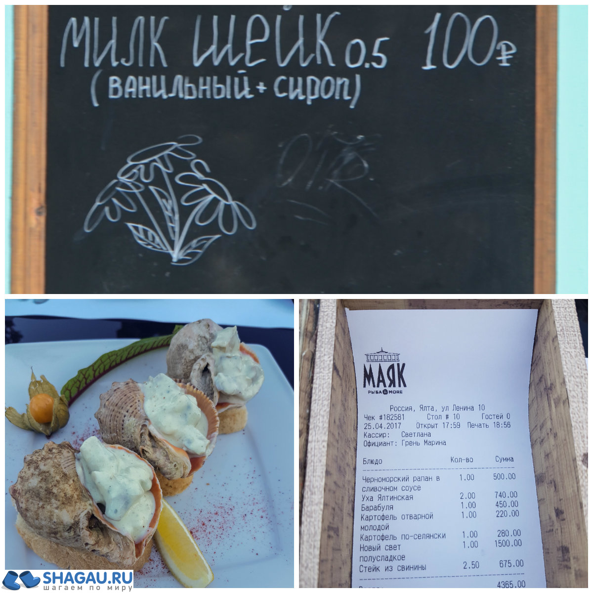 В Ялте на берегу моря нам понравился ресторан «Маяк», в котором ужин с бутылкой местного шампанского обошелся в 4365 р. Рапан в сливочном соусе с оригинальной подачей – 500 р., гламурная ялтинская уха – 370 р., барабуля – 450 р. И это, кстати, далеко не самый дорогой ресторан Ялты. Но не все так страшно, есть в Ялте и столовые, в которых цены не испугают даже бюджетных туристов.