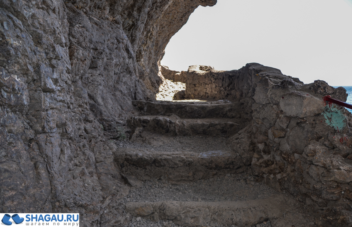 В центре находится уникальная природная достопримечательность – длинный и глубокий сквозной грот. По указу князя Голицына в гроте были прорублены каменные лестницы, позволяющие легко спуститься к морю, а на входе даже была установлена кованная дверь. Сейчас из-за постоянного движения известняковых пород существует угроза обрушения, и грот закрыт для посещения. Так что проходим мыс мимо и двигаемся дальше.