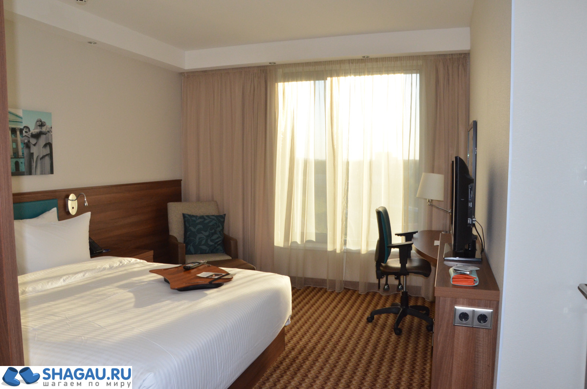 Рядом с отелем находится железная дорога, но мы всегда просим номер повыше, и она нам не мешает. Просторное помещение оформлено современно и стильно. Божественная кровать с двумя подушками на каждого, накрахмаленное белье – какое же блаженство упасть в эту кровать после долгой дороги или прогулке по городу.