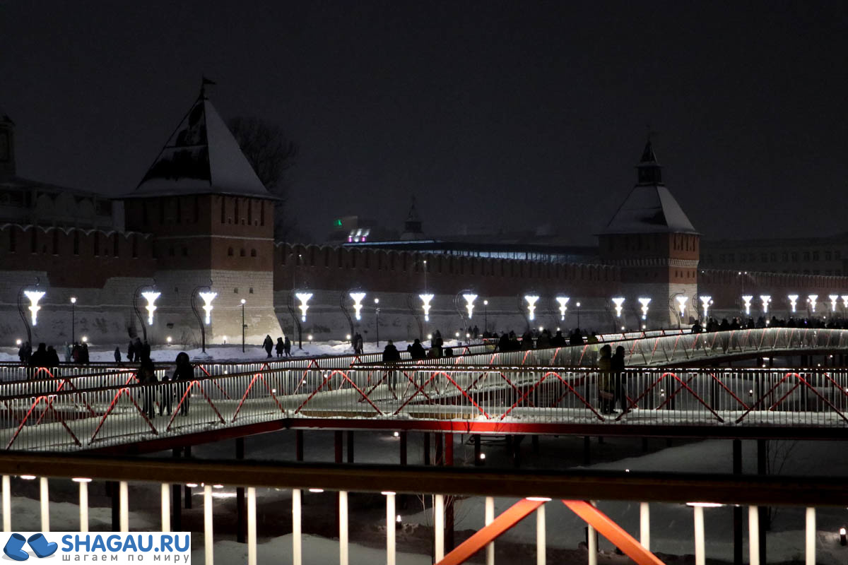 Сейчас это идеальное место для прогулок. Открыты ворота четырёх башен. В любые можно войти и выйти. Ещё совсем недавно было не так. Дело в том, что Кремль стоит на берегу реки Упа, а напротив – корпуса оружейного завода и в целях безопасности пройти на набережную было нельзя. Видимо в этом вопросе что-то изменилось и сейчас благоустроенная Казанская набережная с красивой подсветкой радует местных жителей и гостей города. Старинные корпуса оружейного завода на противоположном берегу также красиво подсвечены.