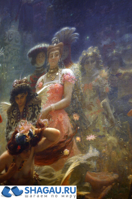 Получив право на заграничную командировку, Репин путешествует по Европе. В Париже он написал картину на былинную тему «Садко». Она представлена на выставке.